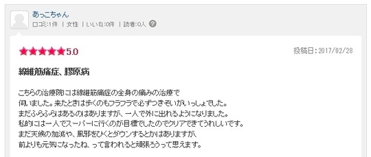 こちらの治療院には線維筋痛症の全身の痛みの治療できました。来たときは歩くのもフラフラで必ず付き添いが必要でした。まだフラフラはあるのですが一人で外に出れるようになりました。