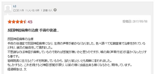 手術の後遺症で反回神経麻痺になり、左側の声帯が動かなくなりました。色々調べて松鶴堂で治療をされているとわかり鍼灸の治療をしていただきました。