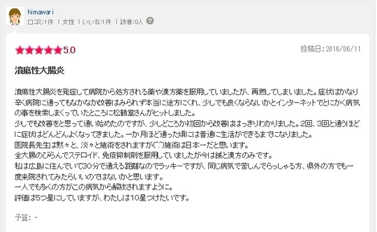 潰瘍性大腸炎を発症して病院から処方される薬や漢方を服用していましたが、再燃してしまいました。症状はかなりつらく病院に通ってもなかなか改善はみられず本当に途方に暮れ、少しでも良くならないかとネットでとにかく病気のことを模索しまくっていたところに松鶴堂さんがヒットしました。