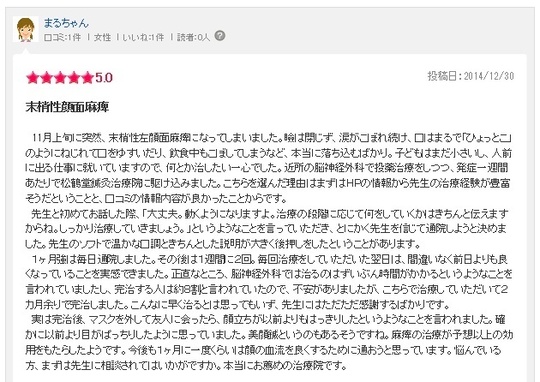 院長先生を指名させていただき、処置をお願いしました。初めは半信半疑でしたが、1回目が終了した後すぐ効果を実感しました。2回目、3回目と回数を重ねていくうちに動かしにくいと思っていたところがどんどん動くようになり、4回目に松鶴堂さんを訪れる頃には顔の動きに違和感を感じることはほとんどなくなりました。顔が動くようになったことで不安でいっぱいだった心にも余裕が出てくるようになりました。院長先生をはじめとして松鶴堂の皆様には感謝の気持ちでいっぱいです。本当にありがとうございました。これからも定期的に通っていきたいと思います。