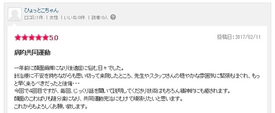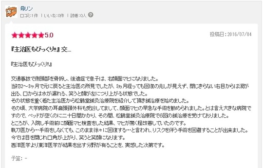 今年の4月いきなり顔面神経麻痺になりました。病院に通ってましたが、治るのがいつになるか分からない、早くても半年位かかるだろうと言われ、不安で顔面麻痺の事を調べている内にこちらのホームページにたどりつき、院長先生が顔面麻痺を治すのが得意だと知り、口コミにも顔面麻痺になった方が短期間で治ったと書いてあったので、藁にもすがる思いでこちらにかかりました。