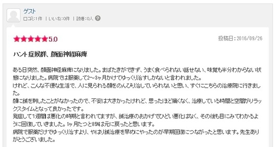 ハント症候群は後遺症が残る方もいらっしゃると聞いていたので覚悟していましたが、私は幸い良い方向に向かいました院長先生に治療していただき不安な事は聞いて前向きになる事が出来たこと感謝しかありません。ありがとうございました