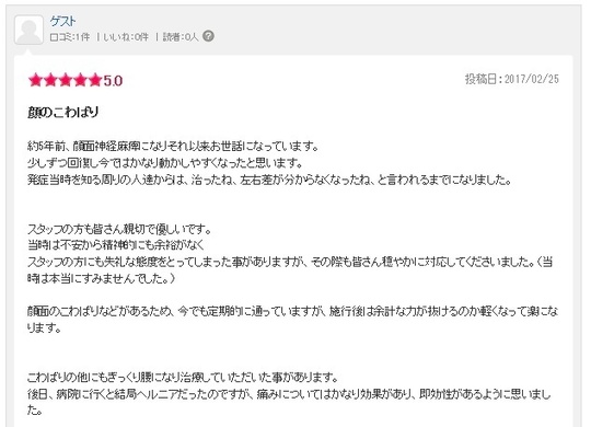 実は完治後、マスクを外して友人に会ったら、顔立ちが以前よりもはっきりしたというようなことを言われました。確かに以前より目がぱっちりしたように思っていました。美顔鍼というのもあるそうですね。麻痺の治療が予想以上の効用をもたらしたようです。今後も1ヶ月に一度くらいは顔の血流を良くするために通おうと思っています。悩んでいる方、まずは先生に相談されてはいかがですか。本当にお薦めの治療院です。