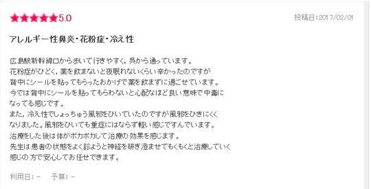 広島駅新幹線口から歩いていきやすく、呉から通っています。花粉症がひどく、薬を飲まないと夜眠れないくらいつらかったのですが、背中にシールを貼ってもらったおかげで薬を飲まずにすごせています。今では背中にシールを貼ってもらわないと心配なほど良い意味で中毒になっている感じです。