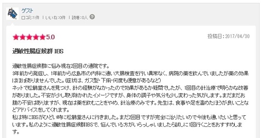 私は特にIBSがひどい時に松鶴堂さんに行きました。まだ2回目ですが完全に治りたいので今後も通いたいと思っています。私のように過敏性腸症候群IBSで、悩んでいる方がいらっしゃいましたら試しに1回行くことをおすすめします。