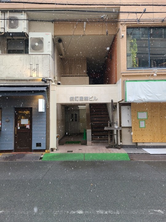 1階の店舗には王将、すずらん薬局、ハンバーガーショップ、餃子屋 弐ノ弐があります。H's Burger stand & Barと餃子屋 弐ノ弐の間が入口になります。入口には右の写真のように袋町産業ビルとの記載があります。
