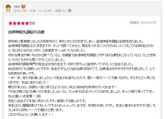 何か治療法がないものかと調べていると、松鶴堂で自律神経失調症に対する鍼治療をおこなっていることを知り、藁にもすがるおもいでいくことにしました。