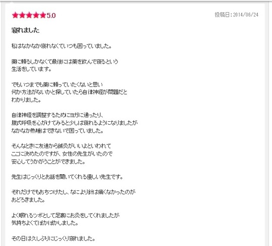 そんな時にこちらのお店を知りました。1回目には美容鍼を受けましたが効果は実感したものの不眠は解消されなかったので先生に相談したところ、台湾小顔矯正をしてみる?と聞かれ興味津々の私はすぐにのりました。効果はありました。悟空の気持ちでのやり方ではないけど私にとっては寝れればいいので。不眠のお悩みの方におすすめです。