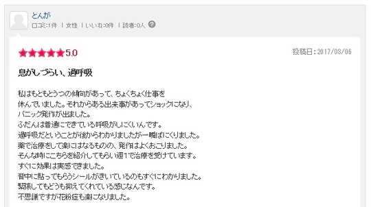 背中にはってもらうシールがきいているのもすぐにわかりました。緊張してもどうも抑えてくれる感じなんです。不思議ですが花粉症もよくなりました。