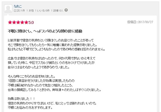 広島では悟空の気持ちがなかったので、何か代用ができないかを考えていて、探していた時に、中区でスカルプ鍼灸というのをみつけてうけましたが自分には合わなかったのであきらめていました。