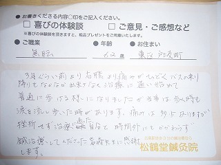 3年ぐらい前よりひどいリウマチになり右膝より痛みがでて、ひどくなりバスの乗り降りもなかなかできなく治療に通いはじめて普通に歩けるようになりましたが、当時は歩くことも涙を流し歩いた時があります。痛みは多少ありますが、挫折せず治療に通った自分と時間外にかかわらず鍼治療してくださった岩崎先生に感謝しております。