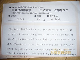 今回、はじめて鍼治療を受けました。初めてなので何もわからず鍼をブスブスと刺されたり、血が出ないのか不安だらけでしたが、問診の時に鍼の説明をしてくださったり、実際に鍼を見せてもらい安心して治療を受けることができました。痛いイメージがありましたが痛くなかったです。